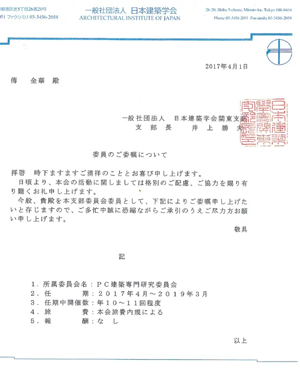 2017年04月01日、弊社耐震解析部部長の傅金華が、日本建築学会よりPC建築専門研究委員およびPC耐震設計小委員に委嘱されました。