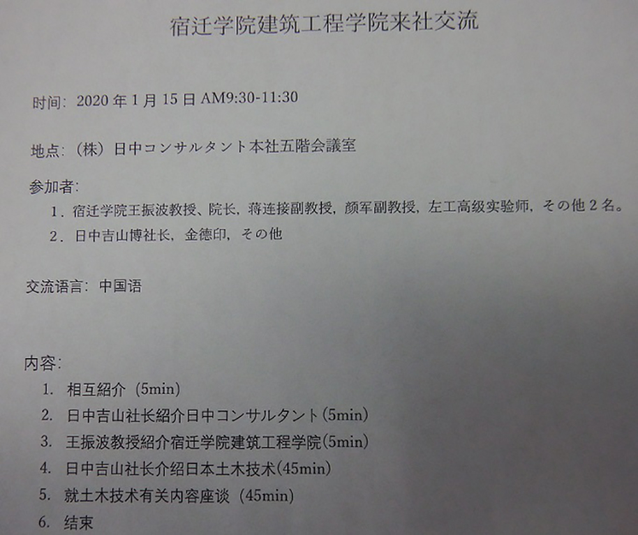 2020年01月15日、中国の宿迁学院建筑工程学院が、東京本社ビルを訪問しました。土木技術の交流会を開催しました。