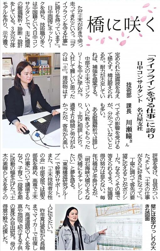 2020年04月15日、弊社名古屋支店の川瀬瞳課長が、「橋梁通信第50号8面」( 2020年(令和2年)4月15日(水曜日)版)(橋梁通信社刊)に掲載されました。「橋に咲く」という特集記事です。女性土木技術者の紹介記事です。
