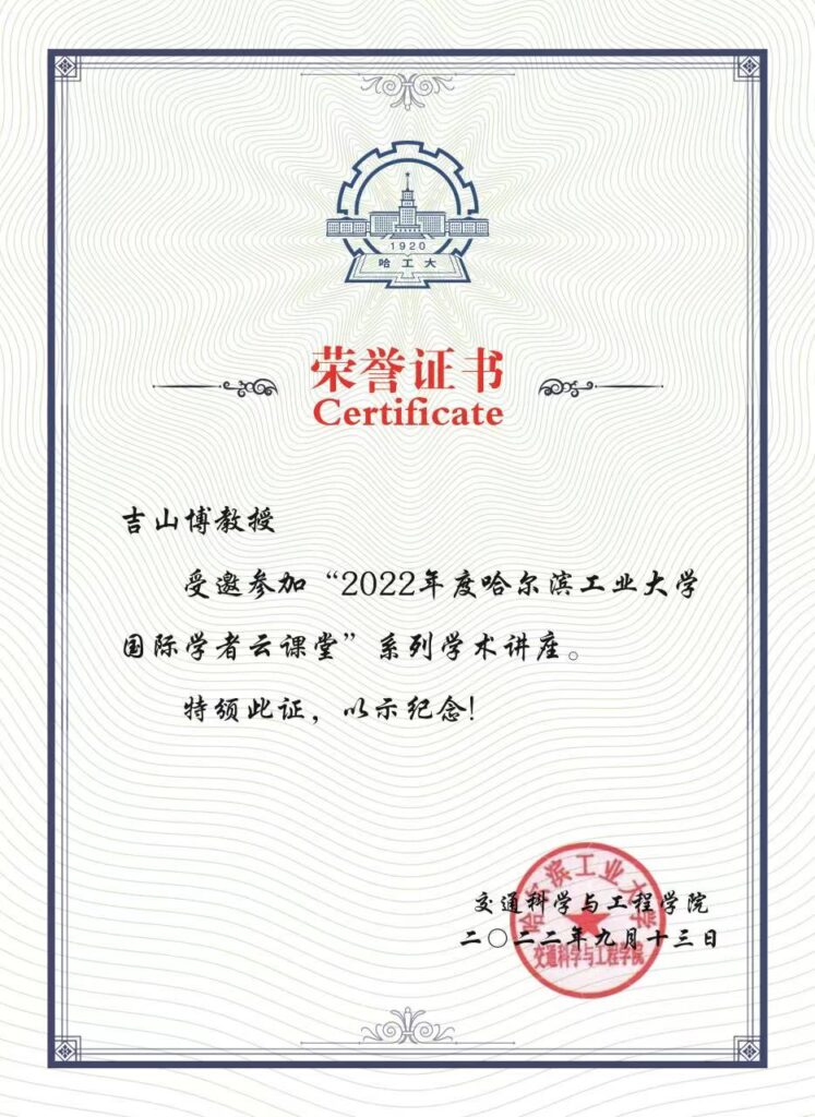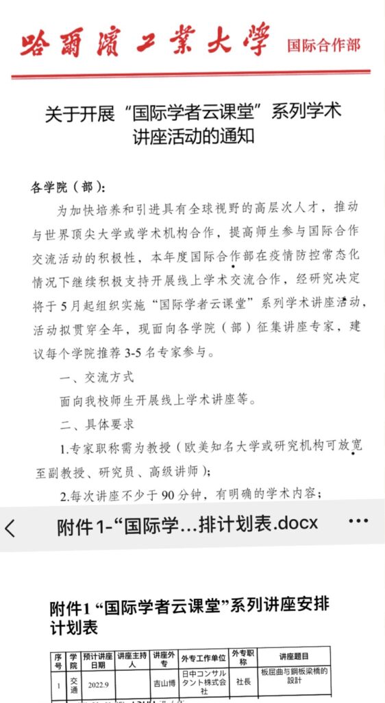 2022年09月16日、弊社代表取締役吉山博が、中国大学の「2022年高水平専家共建課程」向け「鋼板の座屈と鋼板橋の設計」の講習会で、計4回8単位分の講義を行いました。テキスト:「鋼板の座屈と鋼板橋の設計」(吉山博著)。