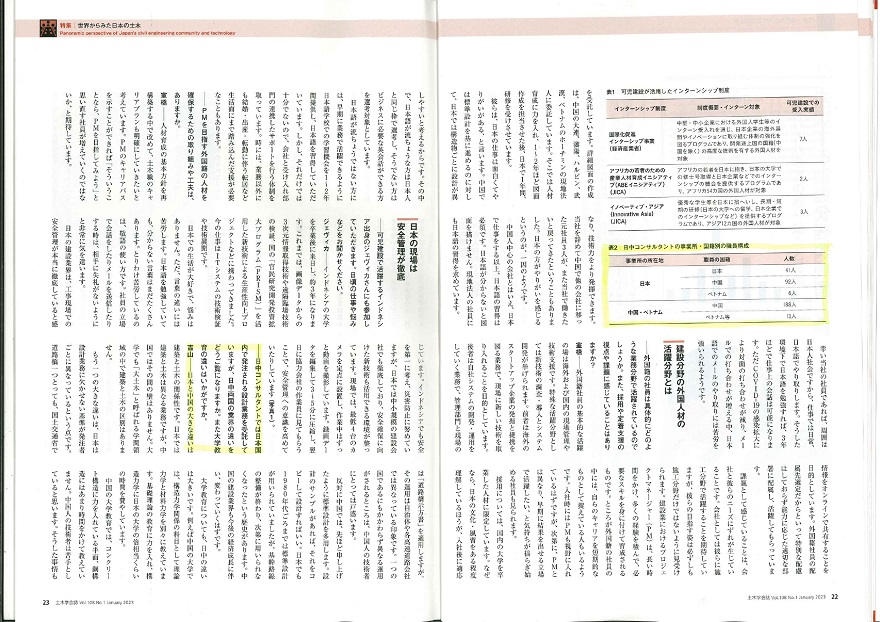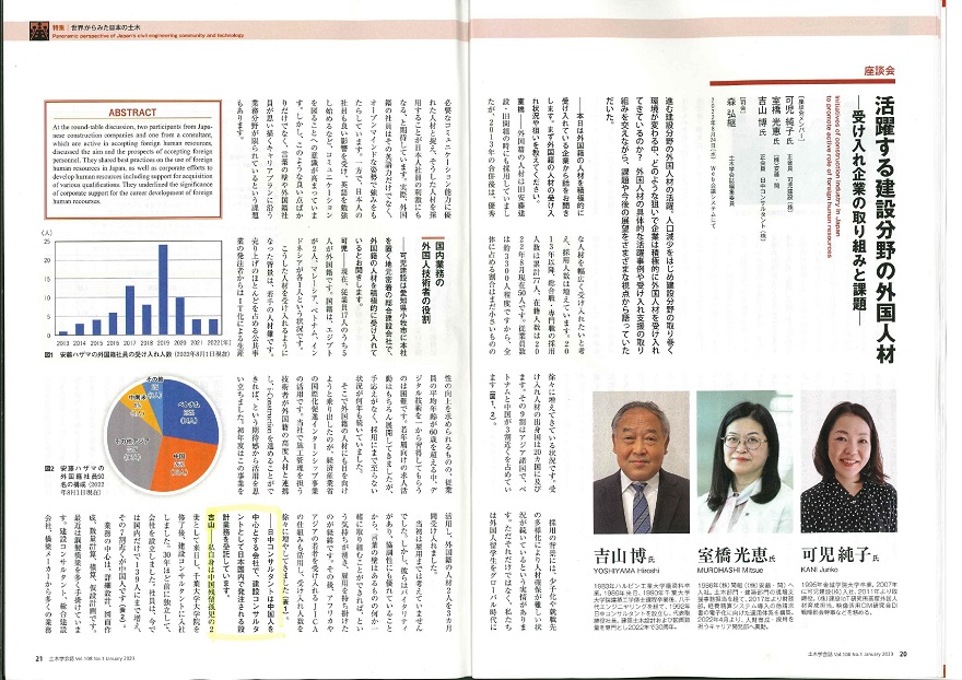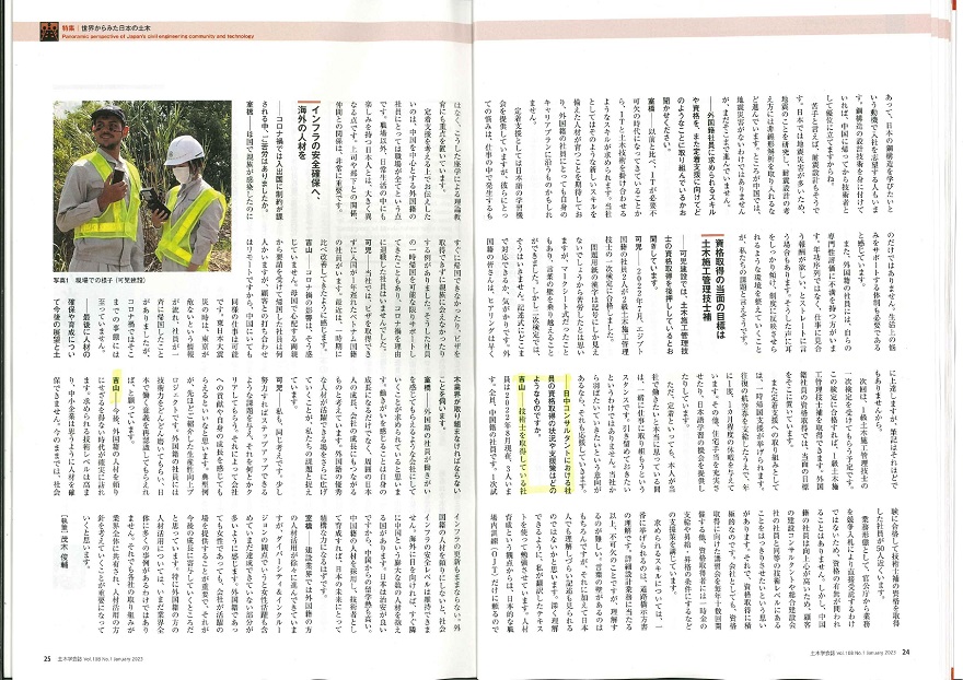 NEWS2023年01月04日、「土木学会誌元旦誌 Vol.108 No.1 January2023」の特集「世界から見た日本の土木」内の「座談会(テーマ:活躍する建設分野の外国人材 – 受け入れ企業の取り組みと課題 – )」記事に、弊社代表取締役吉山博の発言が掲載されました。2022年秋に同座談会に吉山博が出席した時の発言です。